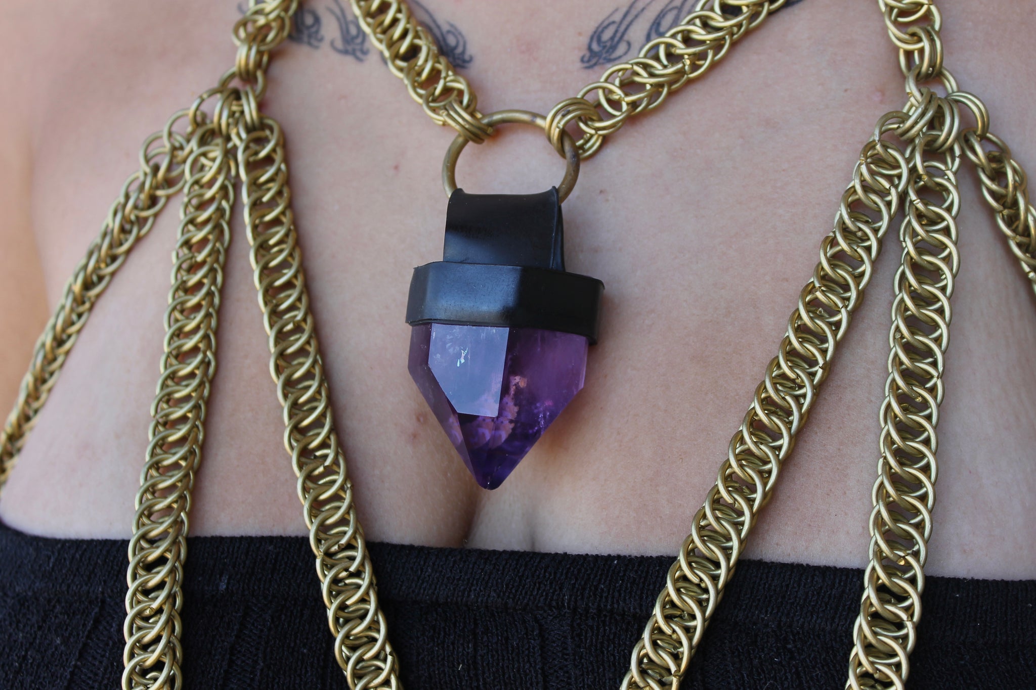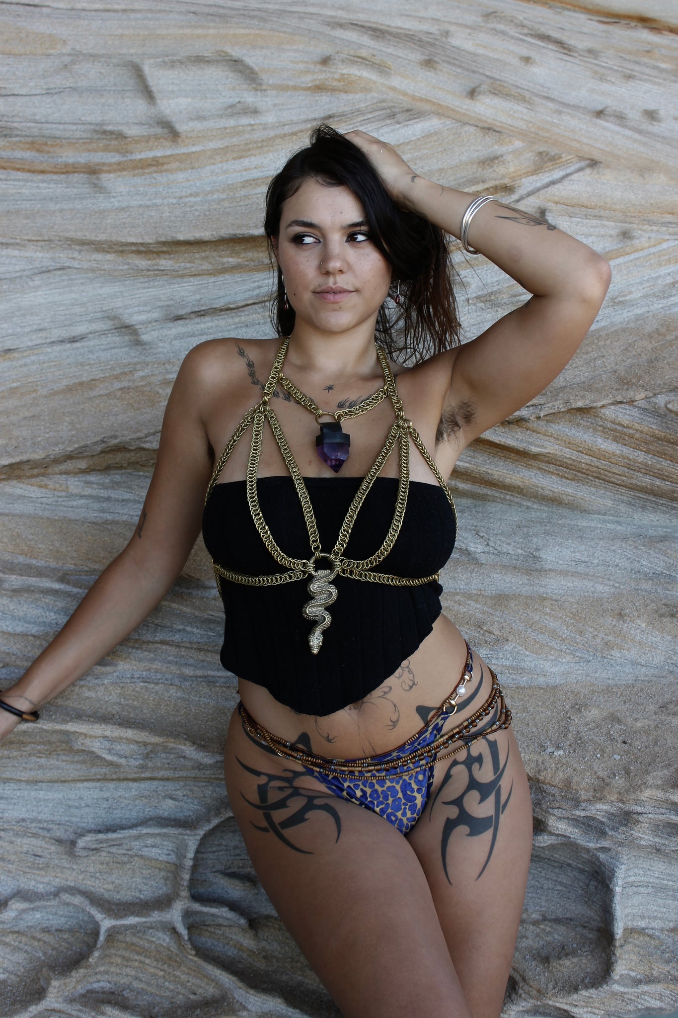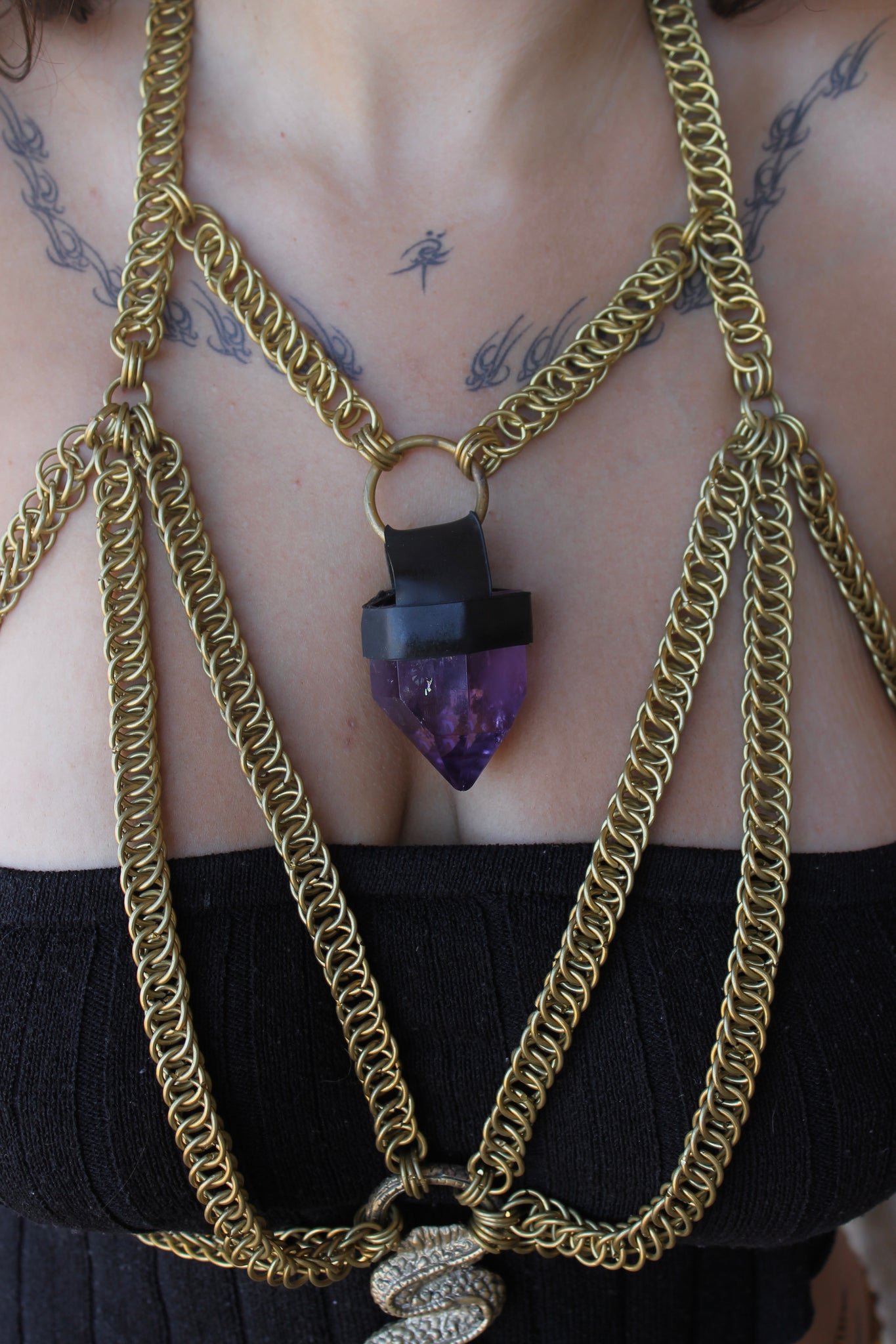 This is, without a doubt, one of my most flattering creations to date—a true union of amour and jewellery. Sphynxxi's first body chain bralette featuring a stunning Australian amethyst delicately positioned between the neckline straps, with an intricately placed serpent at the center, symbolizing strength and transformation.